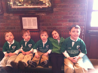 Even so, I've plodded along treating each day as though it's nothing unusual. In the beginning, we were so sleep deprived that it only seemed right to paint each little guy's big toe -- one red, one blue, one green, so we could tell them apart. It seemed natural to dress them in "their" colors and in fact, it still does. When they say your kids are "identical", they are really not kidding. These guys look exactly alike. Des and I can tell them apart -- most of the time. Their big brother and sister can tell them apart -- most of the time. The challenge is when they are either A. naked or B. moving very quickly in opposing directions, as they are keen to do with a jubilant sense of "Game On!"
